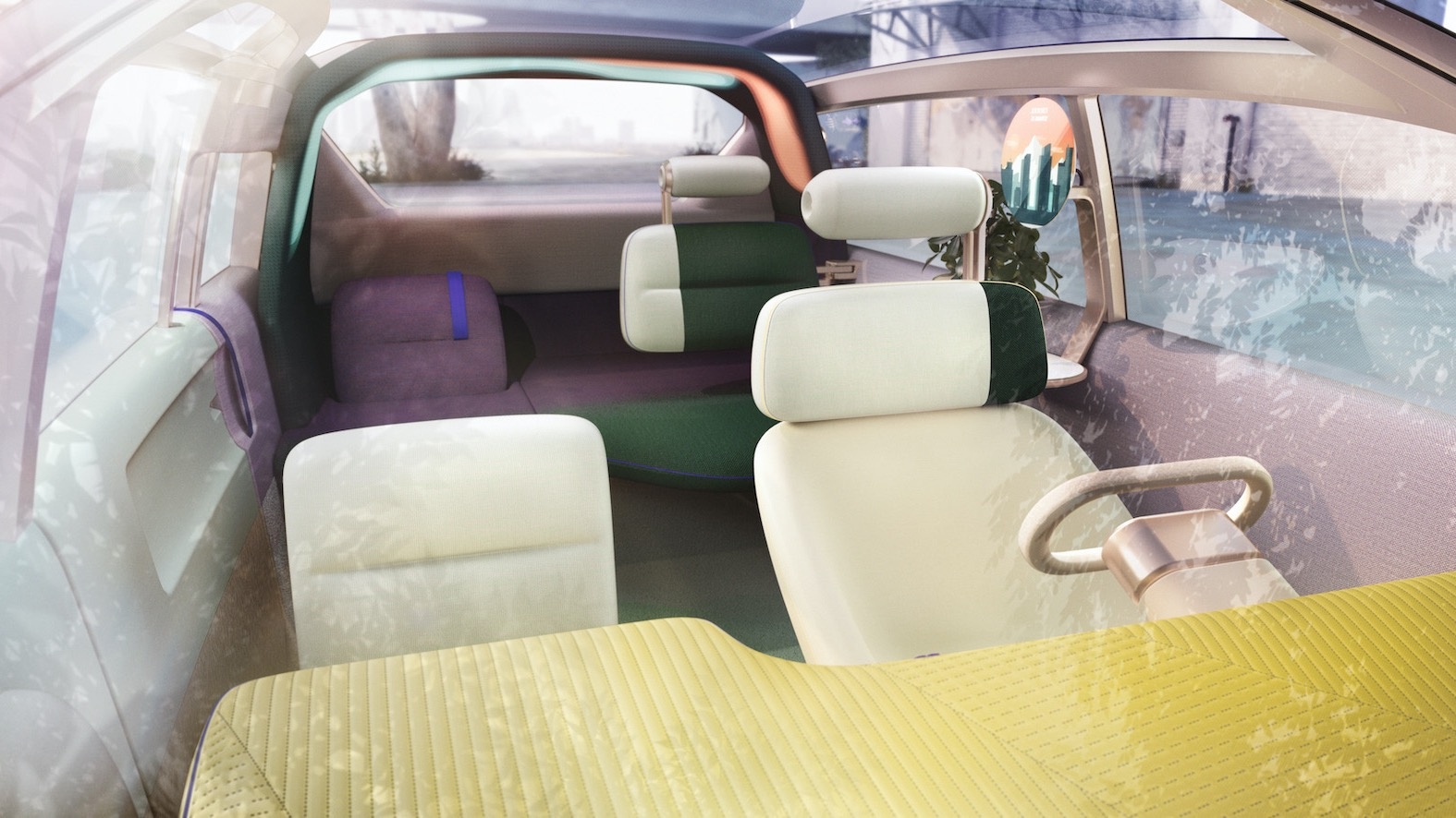 В основе интерьера — гибкая четырехместная компоновка сидений. Два передних сиденья вращаются, а спинки массивных задних сидений можно сложить вручную и повернуть. Когда автомобиль не двигается, приборная панель опускается и водительское кресло превращается в «кушетку» для работы. Также во время стоянки можно поднять лобовое стекло, создав эффект «балкона».